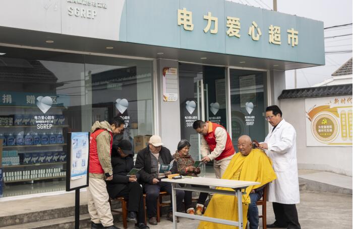 电力志愿者在兴化联镇村电力爱心超市为老人免费理发