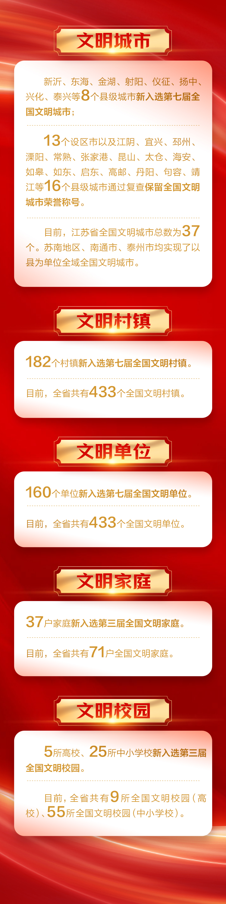 新沂、东海、金湖、射阳、仪征、扬中、兴化、泰兴等8个县级城市新入选第七届全国文明城市,13个设区市、16个县级城市通过复查保留全国文明城市荣誉称号,苏南地区、南通市、泰州市均实现了以县为单位全域全国文明城市。我省182个村镇、160个单位新入选第七届全国文明村镇、文明单位,37户家庭、30所学校新入选第三届全国文明家庭、文明校园,251个村镇、273个单位、34户家庭、34所学校通过复查确认继续保留全国文明村镇、文明单位、文明家庭、文明校园荣誉称号。