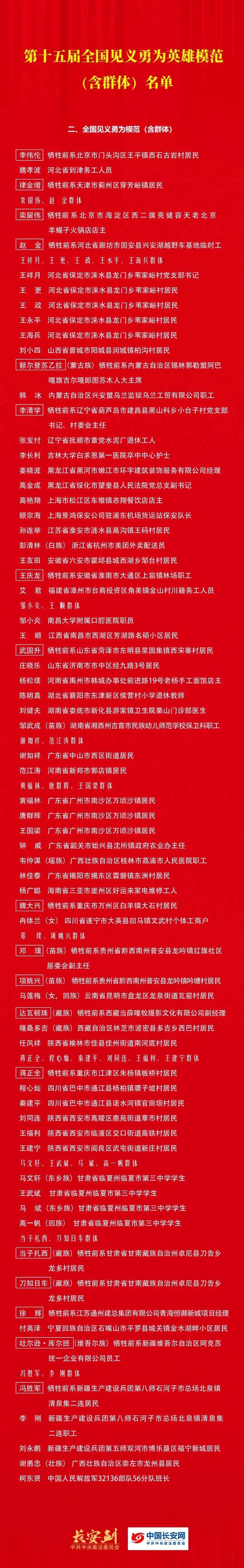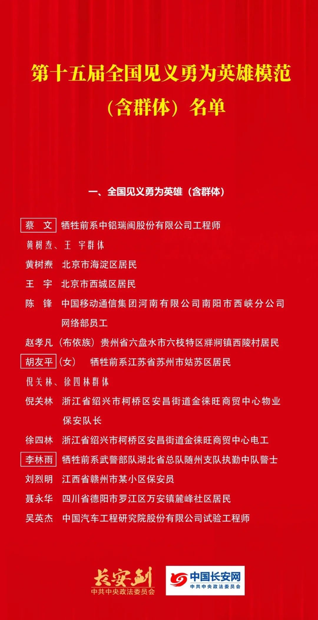 7月21日,第十五届全国见义勇为英雄模范(含群体)名单公布,8名个人和2个群体获“全国见义勇为英雄”称号,40名个人和10个群体获“全国见义勇为模范”称号。