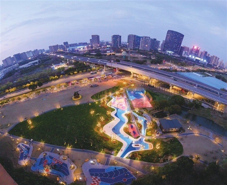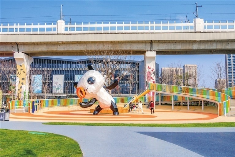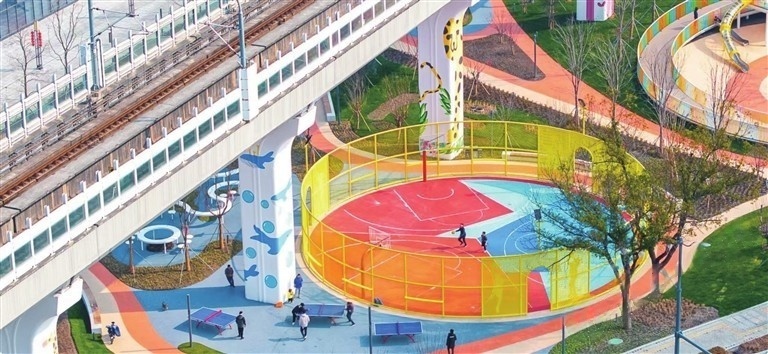 更有诸多充满童趣的角落,让童话照进现实。缤纷运动乐园里,彩色游乐设施点亮空间,一个个小小身影带着清脆笑声追逐奔跑;临湖路桥下空间公园则点燃了孩子们对宇宙的好奇,在他们心中悄悄种下探索未知的种子。