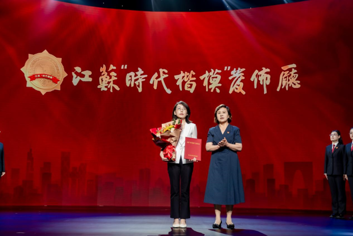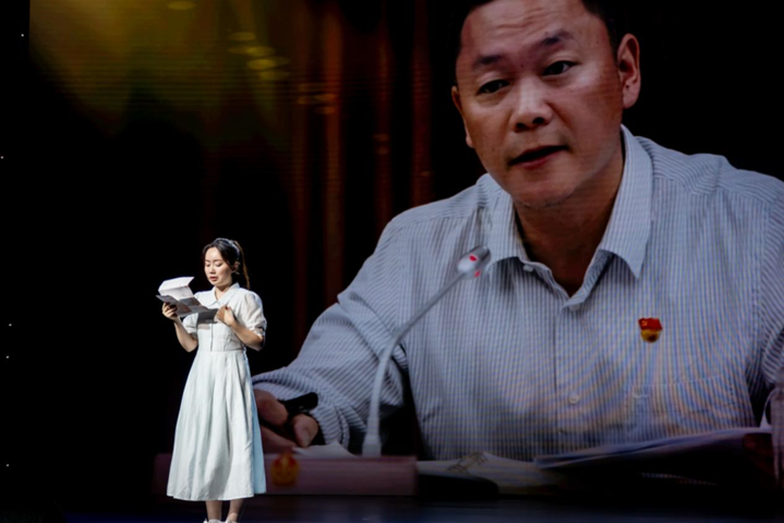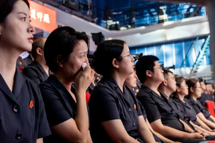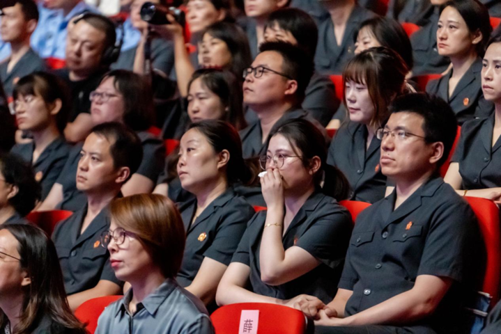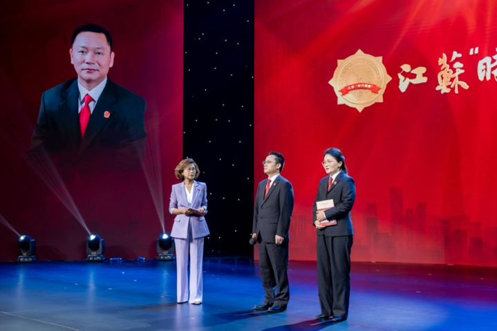 仪征市人民法院青年法官代表集体宣读致敬辞。江苏“时代楷?!?,党的十八大、党的十九大、党的二十大代表,扬州市广陵区曲江街道文昌花园社区党委书记郑翔为边晓斌家属颁发荣誉证书。